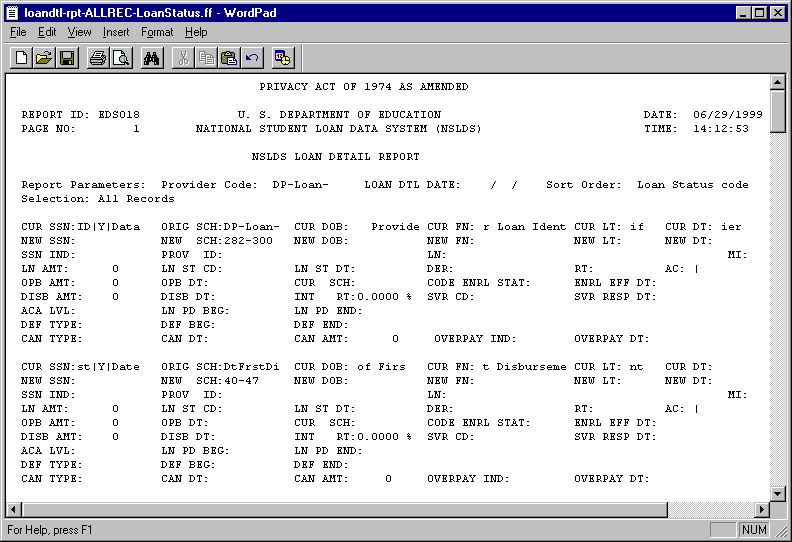 Data field errors that appear on your Load-Process Error Report usually require that you make changes to the respective field(s) in your database before your next extract, (e.g., a typographical error for the Date of Disbursement where your system field had 1896-01-25 instead of 1996-01-25. In this instance, NSLDS would reject that date as being prior to the loan program’s existence). In your next Submittal file, you must submit a Past Period Change with a Date of First Disbursement of 1996-01-25.