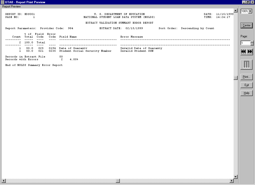 There is one significant difference between the two summary error reports. The Summary Extract Error report summarizes only the domain-level errors in your Database Extract file, while the Summary Load Process Error report summarizes all the domain-, record-, and load-level errors in your Database Extract file. Thus, the Summary Load Process Error report offers a fuller picture of the types of errors that occur in your Submittal file. However, the Summary Extract Error report identifies domain-level errors earlier in the NSLDS update process, and it is invaluable if you need to lower your rate of domain-level errors beneath the ED-established threshold levels in order to create a Submittal file at all.