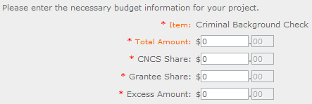 Below are the instructions for each line item of the budget form. For each line item, you will have to document the CNCS Share, Grantee Share, and the Excess Amount.