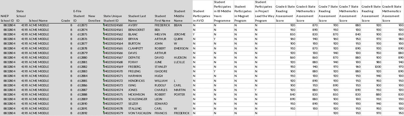 The Student List template will include the following information for each record: NAEP School ID; State School ID; School Name; Grade; E-File Student ID (used for data processing); New Enrollee; State Unique Student ID (if it was included on the E-File); Student First Name; Student Middle Name; and Student Last Name.