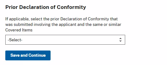 Additional Directions: Pursuant to 15 CFR Part 791.305(f), if a connected vehicle manufacturer or VCS hardware importer determines that articles subject to a Declaration of Conformity are no longer eligible, it must, within 30 days, cease any prohibited conduct and submit a specific authorization application. If this is the reason for your specific authorization application, please associate the previous Declaration of Conformity below.