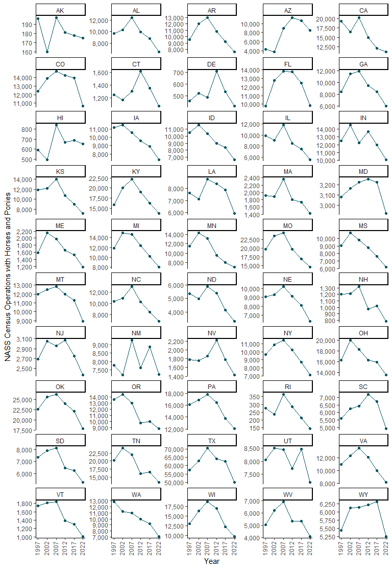 State selection for Phase I of the study was considered based on the percentage of equine inventory and operations, equine density, and the trends of the counts of equine inventory and operations, by State. Population counts were taken from the 2022 Census of Agriculture data. The overall inventory and operation counts, by operation size, are given in Table A.1, while State-level inventory and operation counts, percentages, and equine density are presented in Table A.2. Historical equine inventory and numbers of equine operations were taken from the same two reports and are depicted in Figures A.1–A.2. For comparison, the States included in previous NAHMS Equine studies are included in Figure A.3 and the proposed regions for the Equine 2026 Study are depicted in Figure A.4.