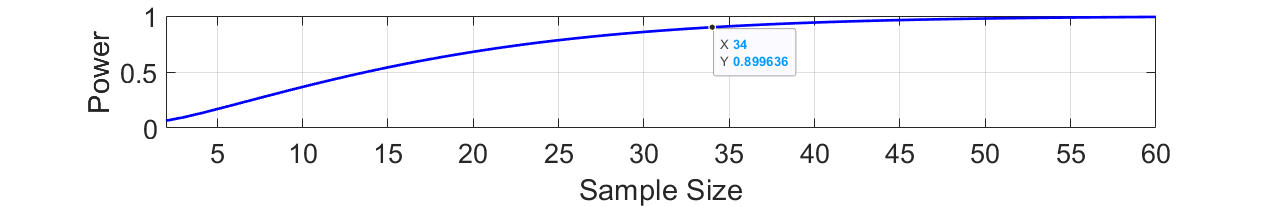 To arrive at the total number of respondents needing to be recruited, the minimum number of respondents needed is first determined. Responses from 26 Feasibility Test respondents answered the research question on whether the online Feasibility Test could replicate results from a previous in-person experiment. The Feasibility Test had its respondents use a continuous 11-point annoyance rating scale. The VANGARD test will use also use an 11-point annoyance rating scale, but a discrete set of 11 points will be used as recommended by the standard from Ref. [3]. A numerical rating of “0” means “Not at all annoyed,” and a numerical rating of “10” means “Extremely Annoyed.” Power analysis was performed to determine the number of VANGARD respondents needed to have a 90% probability (power) of detecting a mean response difference of one numerical annoyance rating between two sound stimuli. Being able to differentiate between one numerical mean annoyance rating between two stimuli will increase the possibility that the sign test and linear regression techniques, which will be discussed in Statement B4, will also be able to determine statistically significant results. To perform the Power analysis, the standard deviation of responses to one stimulus, whose mean annoyance response serves as the null hypothesis, is assumed to have the same value as the average standard deviation of responses to all Feasibility Test stimuli that were determined to have normally distributed responses. The result of the Power analysis is shown in Figure 1. Thirty-four respondents are needed for a power of 0.90. Combining the fact that 26 Feasibility test respondents provided data to obtain statistically significant results, and 34 respondents being the number needed for a power of 0.90, it is preferred that 30 respondents in each ambient region of each metropolitan area are available for analyses.