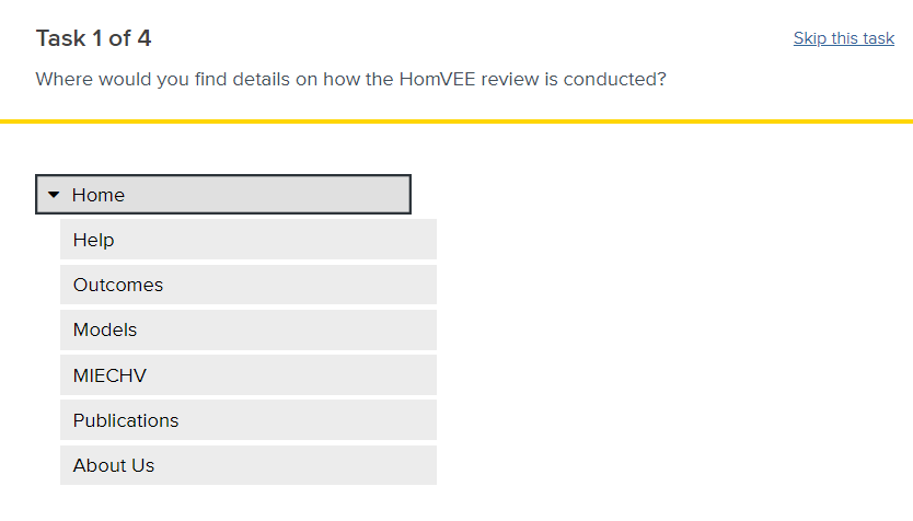 This document describes our plan for testing the Home Visiting Evidence of Effectiveness (HomVEE) website’s Information Architecture to discover issues impacting the usability of the site.