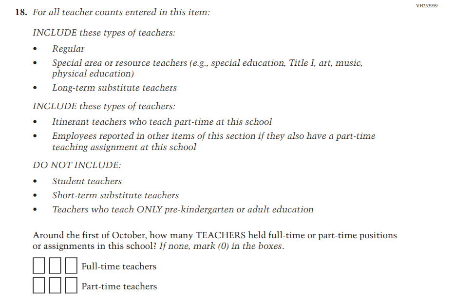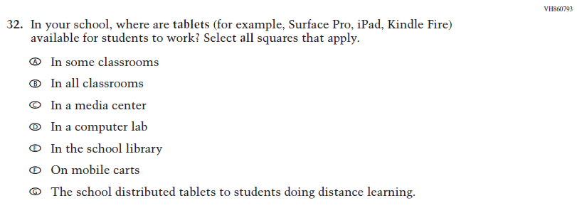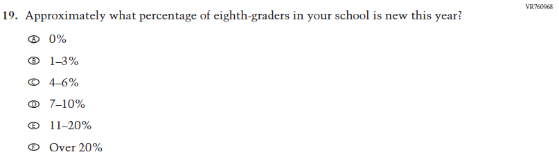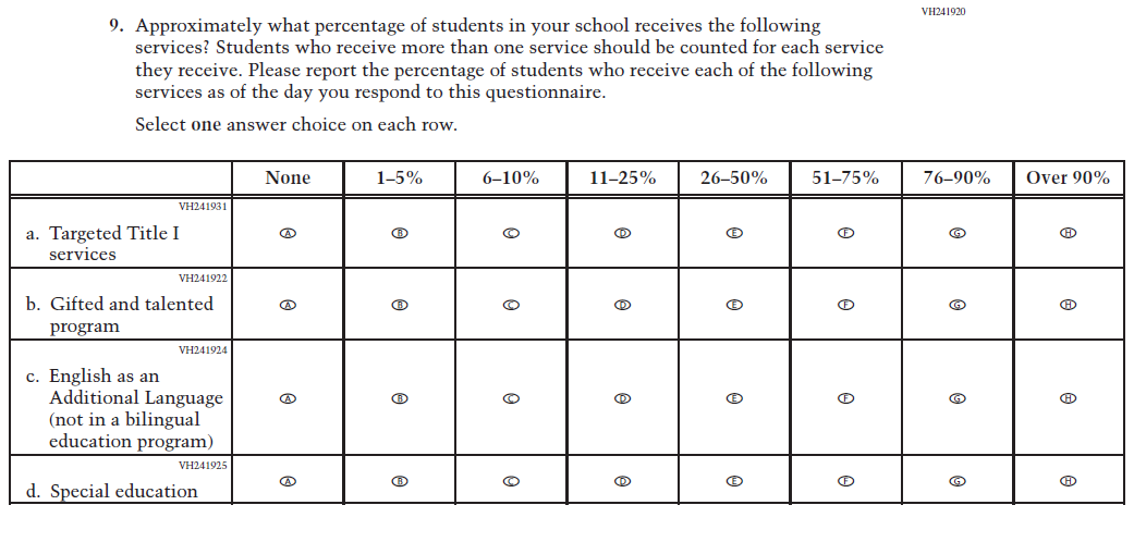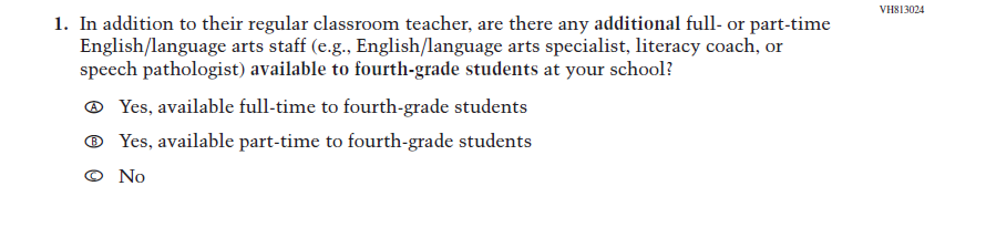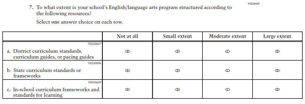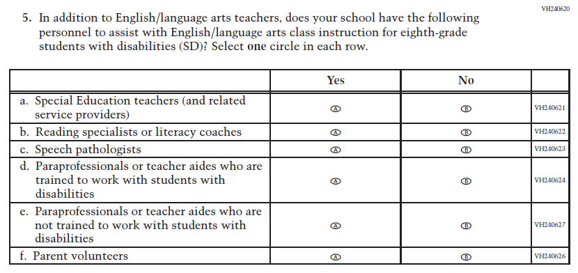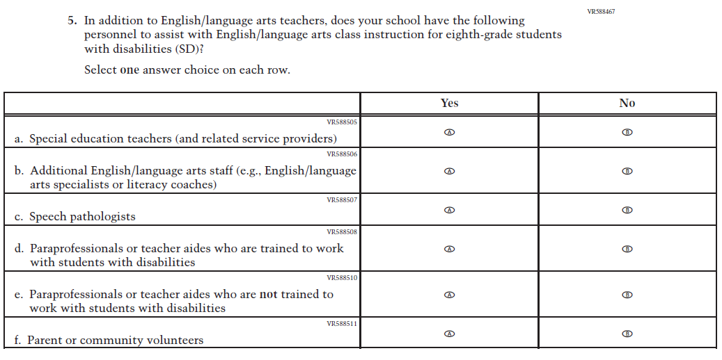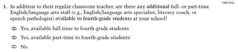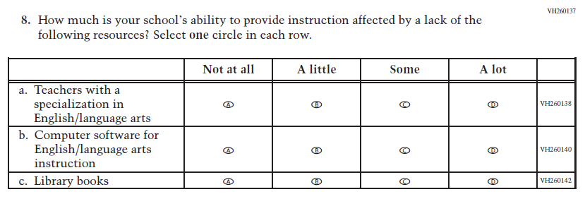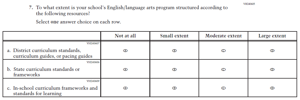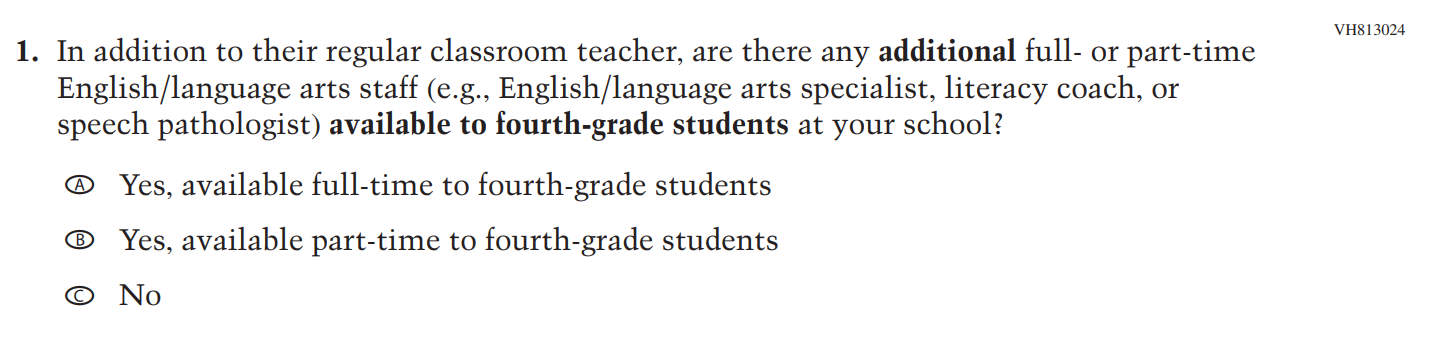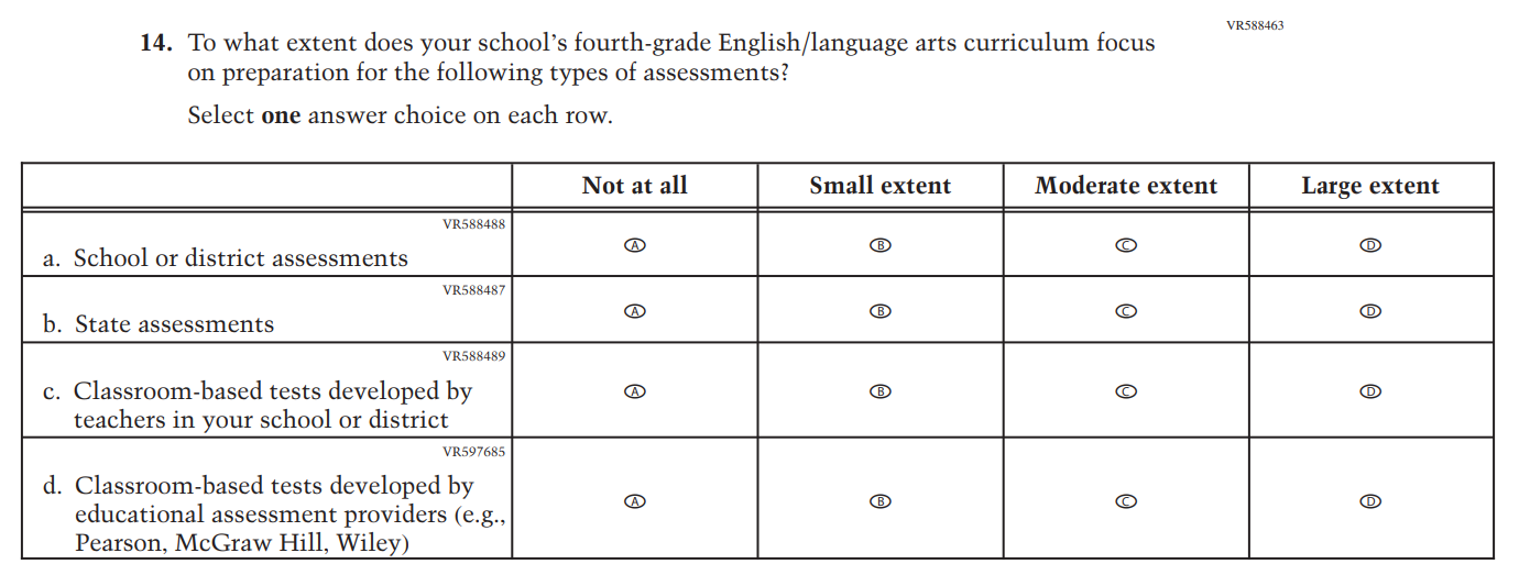 For 2026, we have aligned Inline Directions in Teacher and School Items with the Directions currently used in Student Items. Also, in SubItem g. “English-language learners” was updated to “English learners” to be consistent with other Items. |