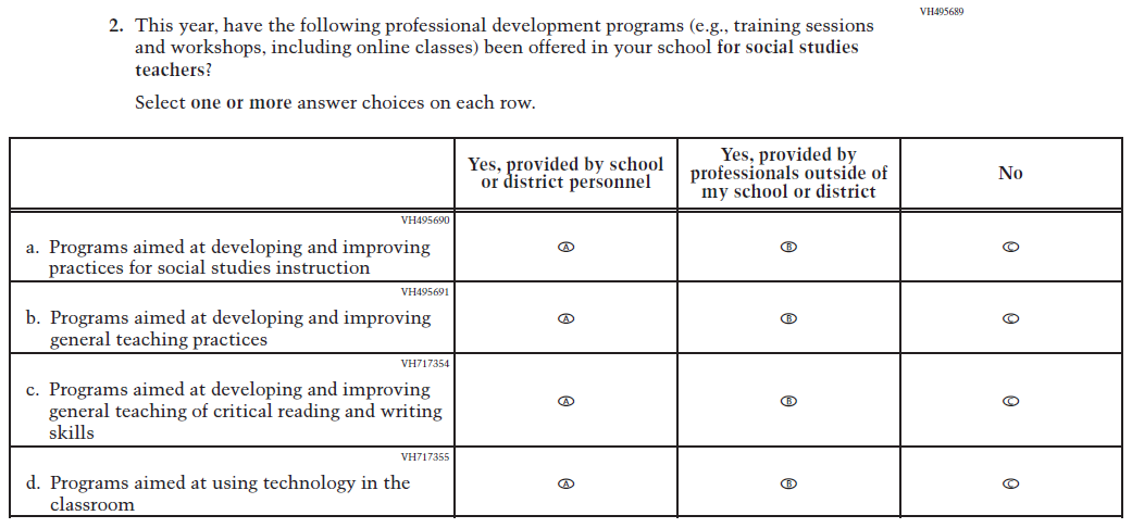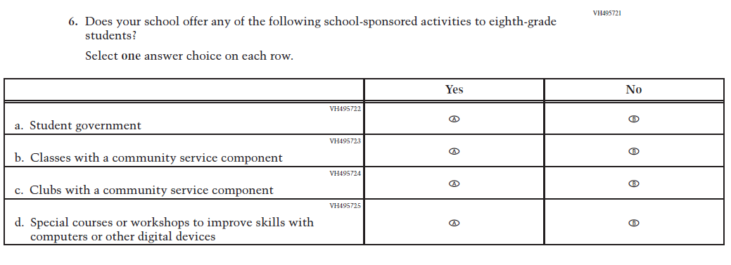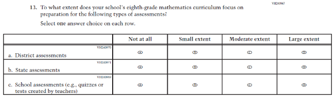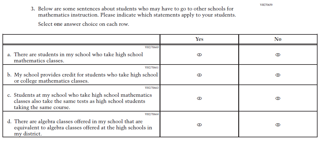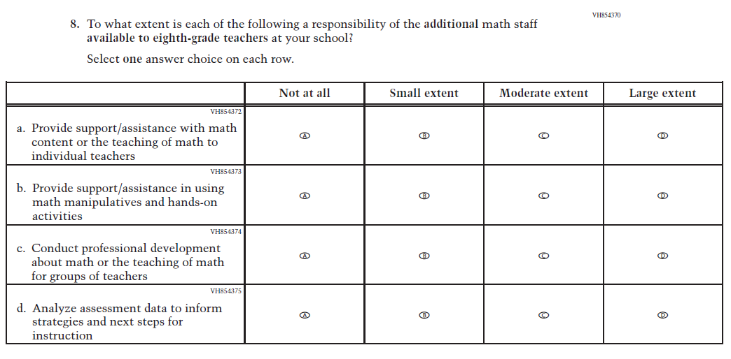 For 2026, we have aligned Inline Directions in Teacher and School Items with the Directions currently used in Student Items. Subitems a, c, and d were revised for clarity, and new subitems c and g were added to capture activities related with mathematics offered by schools. |