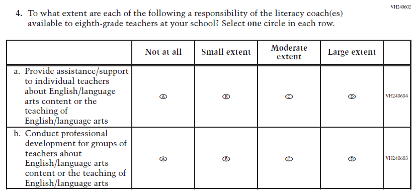 For 2026, we have aligned Inline Directions in Teacher and School Items with the Directions currently used in Student Items. Subitems a, b, d, and e were revised for clarity. |