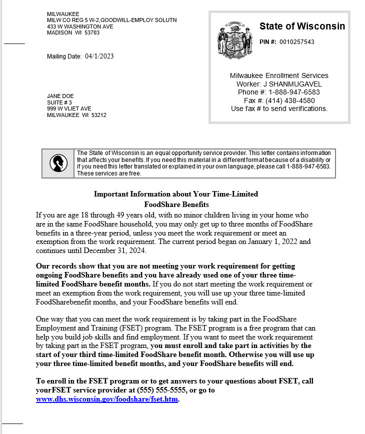 Here is a letter that someone receiving FoodShare benefits might receive. Please take a few minutes to read the letter and then we will talk about it. If needed: Please remember to say what comes to mind as you are reading.
