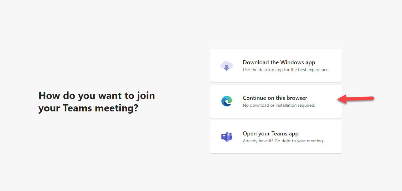 If you already have Teams installed, feel free to use that. Otherwise select “continue on this browser.” Do NOT use Firefox: