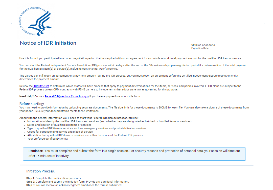 By using forms we provide for use in connection with the Federal Independent Dispute Resolution (IDR) process, you agree to the collection and use of information as described in this Privacy Act Statement.