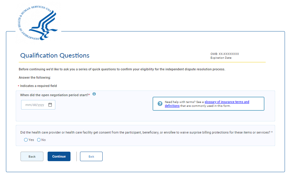 Before continuing we'd like to ask you a series of quick questions to confirm your eligibility for the payment dispute process. This process allows health care providers, plans, and issuers to resolve payment disputes. If you're an uninsured patient, self-paying patient, or insured patient visit https://www.cms.gov/nosurprises.