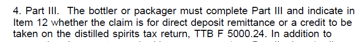 Specific to this information collection, approved under OMB control number 1513–0042, the TTB regulations 27 CFR 28.190, 28.192, 28.195b, and 28.199 require distilled spirits export drawback claimants to submit such claims using form TTB F 5110.30, Drawback on Distilled Spirits Exported. Currently on that form, in Item 12, drawback claimants may request payment of their drawback claim by check or as a credit to be taken on their alcohol excise tax return.