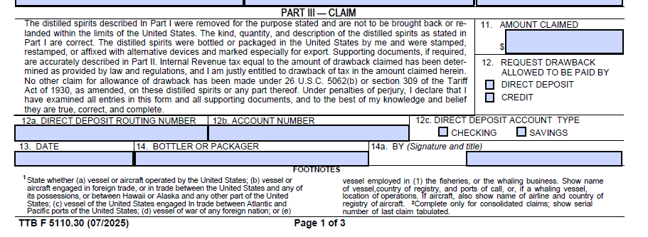 In response to E.O. 14247, TTB is revising form TTB F 5110.30 to eliminate the drawback claimant’s option to receive a paper check. Item 12 on the form will now allow the claimant to choose to receive their excise tax refund by direct deposit or as a credit to be taken on their alcohol excise tax return. In addition, if the claimant selects the direct deposit option, TTB has added Items 12a, 12b, and 12c to the form to allow the claimant to supply their direct deposit routing and bank account numbers, and to state if the account is a checking or savings account. TTB has also revised the instructions on the form to reflect the revision of Item 12.