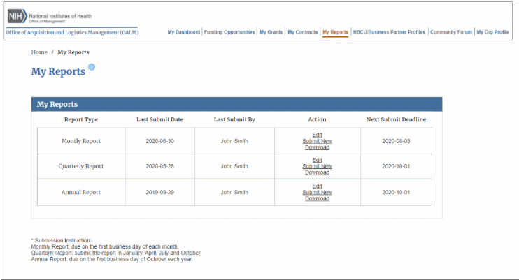 Reporting dashboard to edit, submit, and download monthly, quarterly, and annual reports