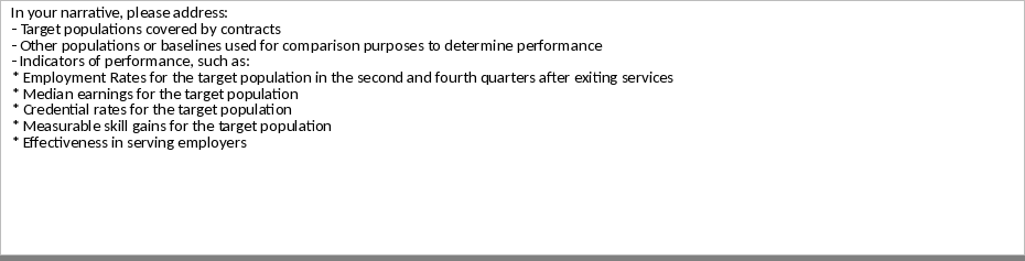 Persons are not required to respond to this collection of information unless it displays a currently valid OMB control number. Respondent’s reply to these reporting requirements is mandatory (Workforce Innovation and Opportunity Act, Section 116). Public reporting burden for this collection of information is estimated to average 25 hours per response, including the time for reviewing instructions, searching existing data sources, gathering and maintaining the data needed, and completing and reviewing the collection of information. Send comments regarding this burden estimate to the Office of Policy Development and Research ● U.S. Department of Labor ● Room N-5641 ● 200 Constitution Ave., NW, ● Washington, DC ● 20210.