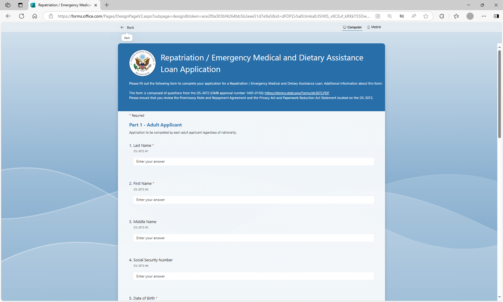 The MS form will be utilized by loan applicants to more efficiently submit their information for a repatriation or EMDA loan application to U.S. posts abroad. Posts will utilize the MS Forms tool to auto populate the form DS-3072 to prepare the form prior to the applicant’s arrival at the U.S. Consulate or Embassy, thereby streamlining the application review and approval process.
