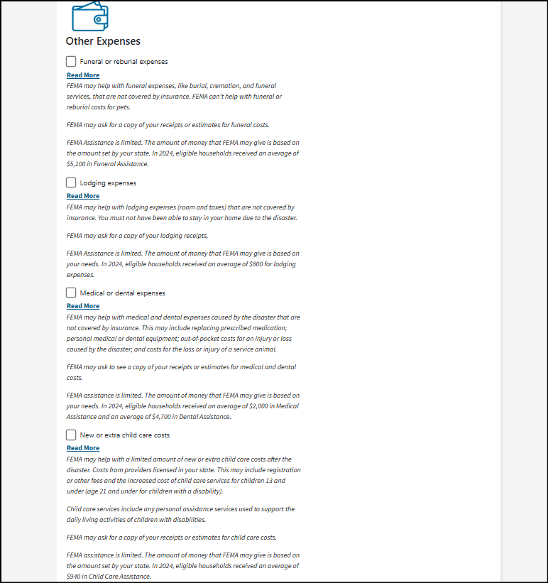 • Other Needs Assistance - This can help with some immediate needs when you can't live in your home. It may cover certain losses and expenses caused by the disaster. Things like personal property and vehicle losses; medical, dental, child care, moving and storage, and funeral expenses."