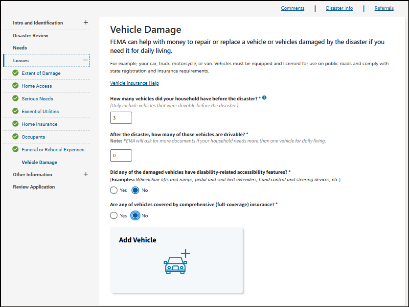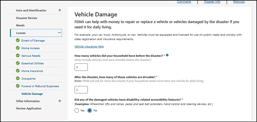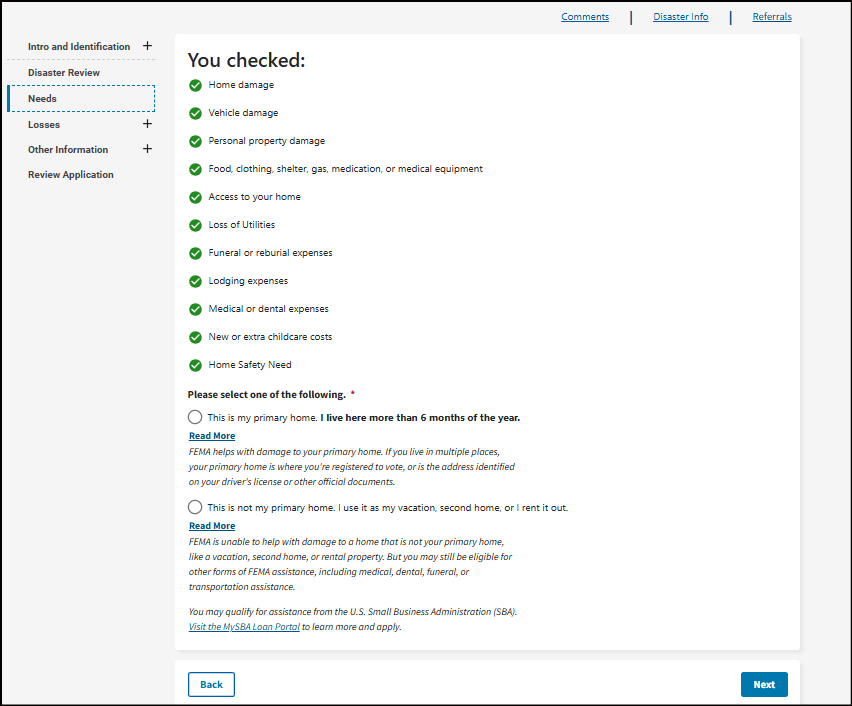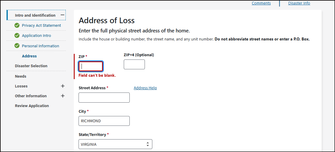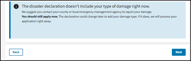 This may be your home address, where your vehicle was damaged, where you sustained an injury from the disaster, or where your loved one passed away from the disaster. To get assistance, your damaged property or where the loss occurred must be in a declared disaster area.