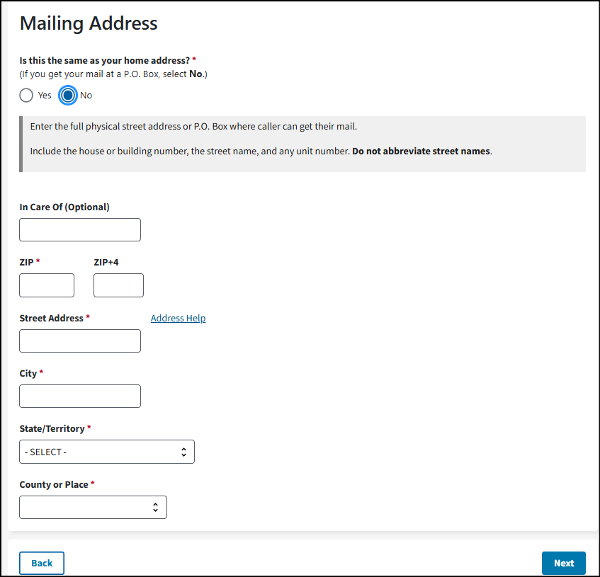 Include the house or building number, the street name, and any unit number. Do not abbreviate street names or enter a P.O. Box.