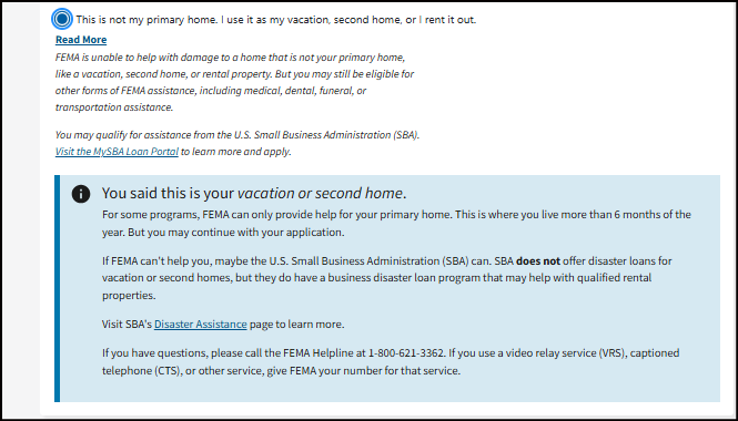 If the caller has business needs ONLY — like business property damage or economic losses caused by the disaster — refer them to the Small Business Administration (lending.sba.gov). SBA offers low-interest disaster loans for home, personal property (including for renters), and business losses.