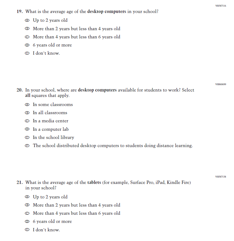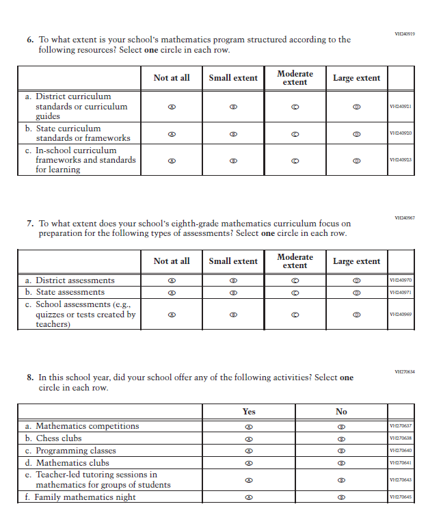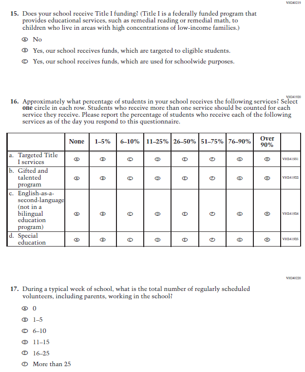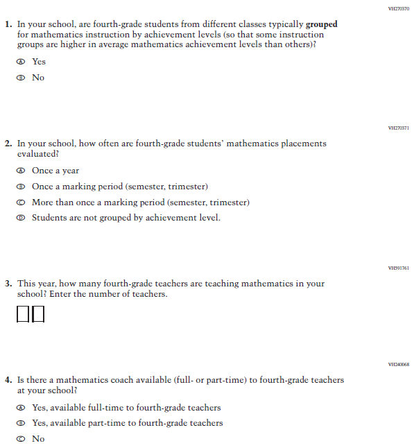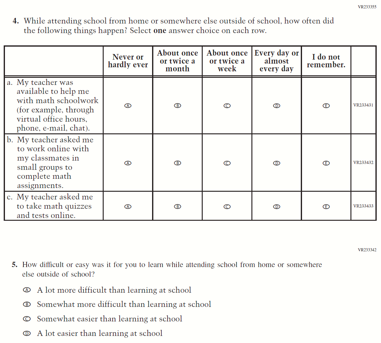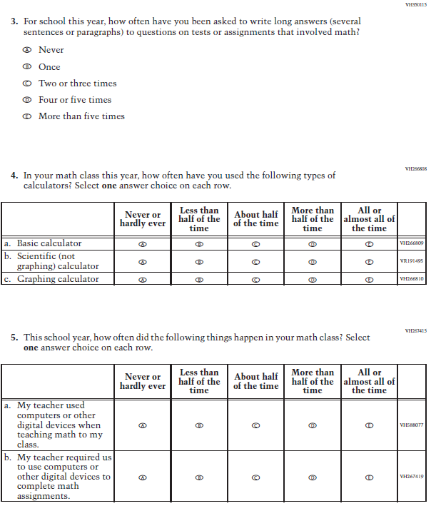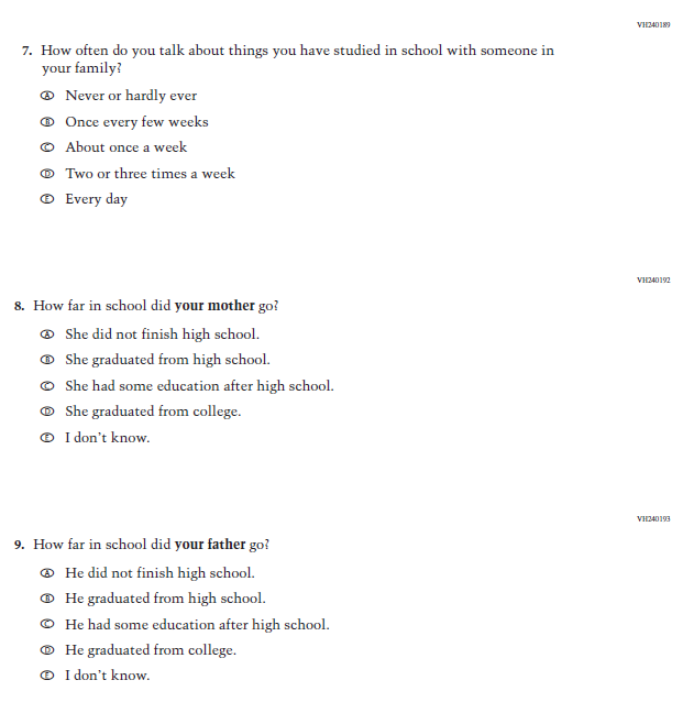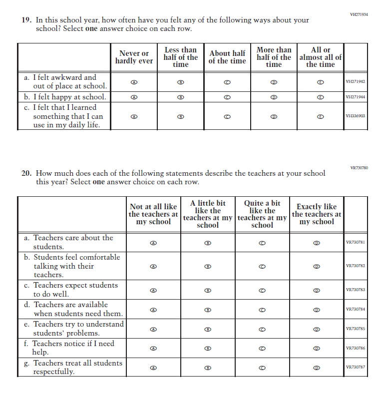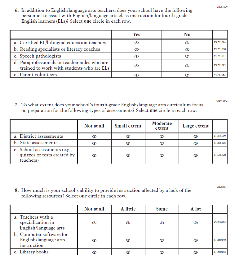 This Appendix F provides the library of possible items to be used in the NAEP 2026 questionnaires. Non-substantive wording changes to the questionnaire items (based on ongoing and future cognitive and pilot testing results), if any will be made, along with the final selection of which items will be used in the final versions of the NAEP 2026 questionnaires, will be provided as outlined below. The number of items selected for each type of respondent will be appropriate to the allocated time (as indicated in the Supporting Statement Part A section A.12).