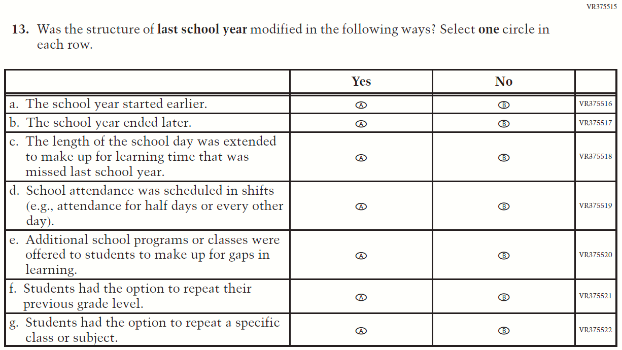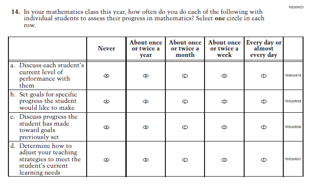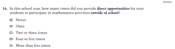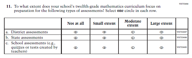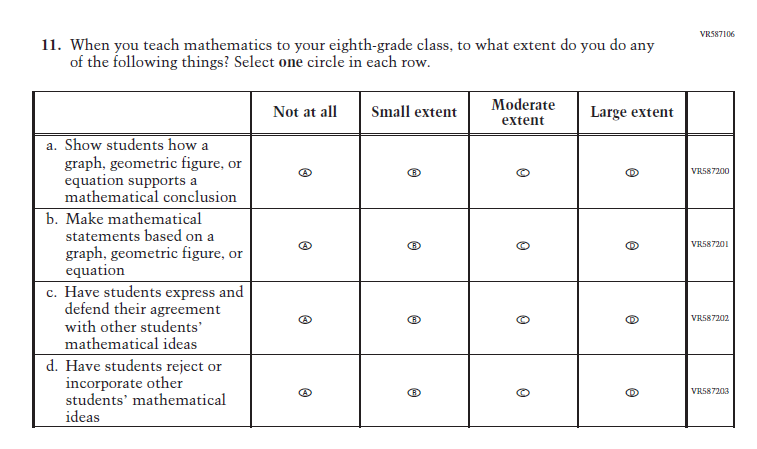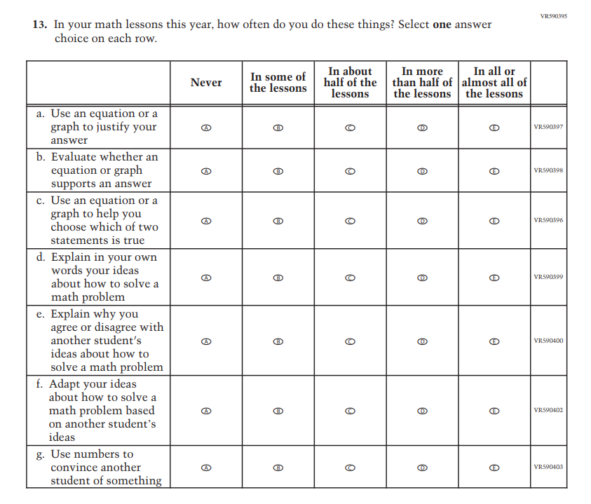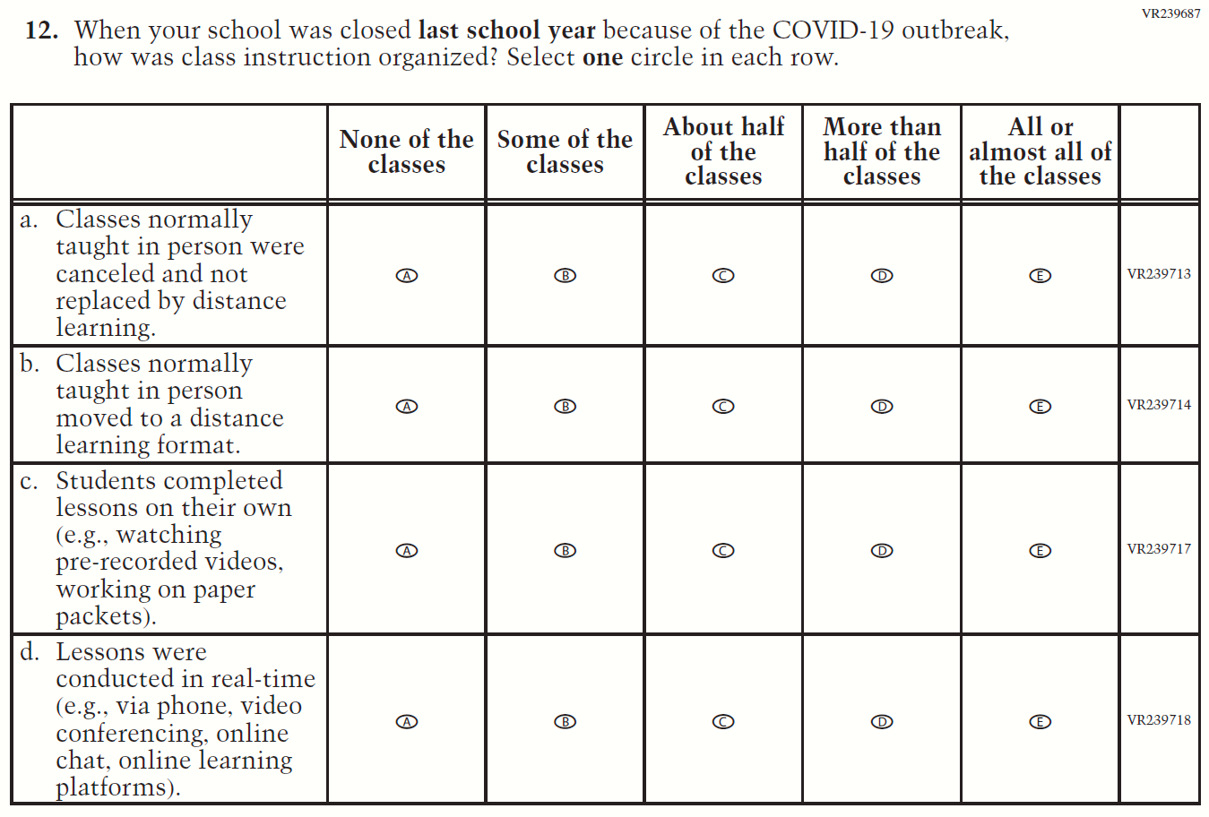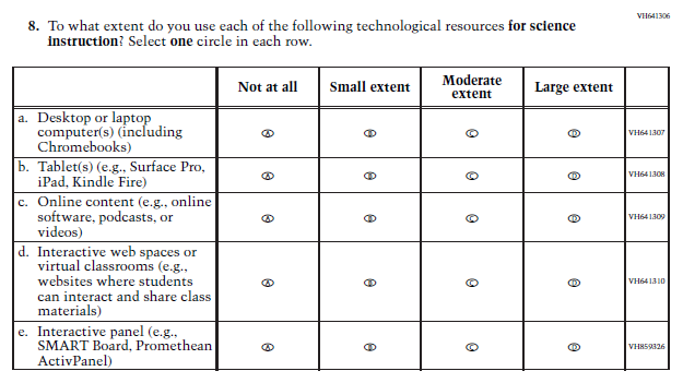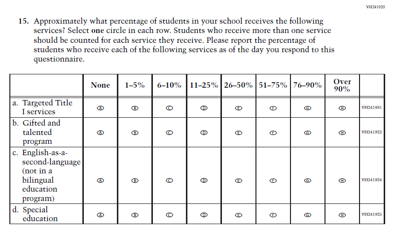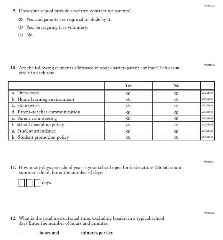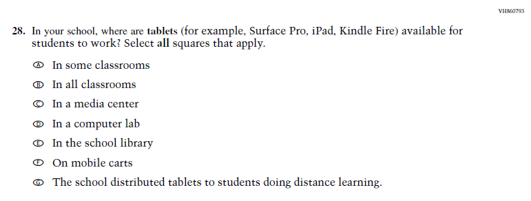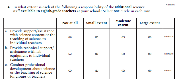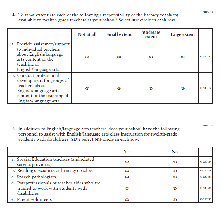 This Appendix F provides the library of possible items to be used in the NAEP 2026 questionnaires. Non-substantive wording changes to the questionnaire items (based on ongoing and future cognitive and pilot testing results), if any will be made, along with the final selection of which items will be used in the final versions of the NAEP 2026 questionnaires, will be provided as outlined below. The number of items selected for each type of respondent will be appropriate to the allocated time (as indicated in the Supporting Statement Part A section A.12).