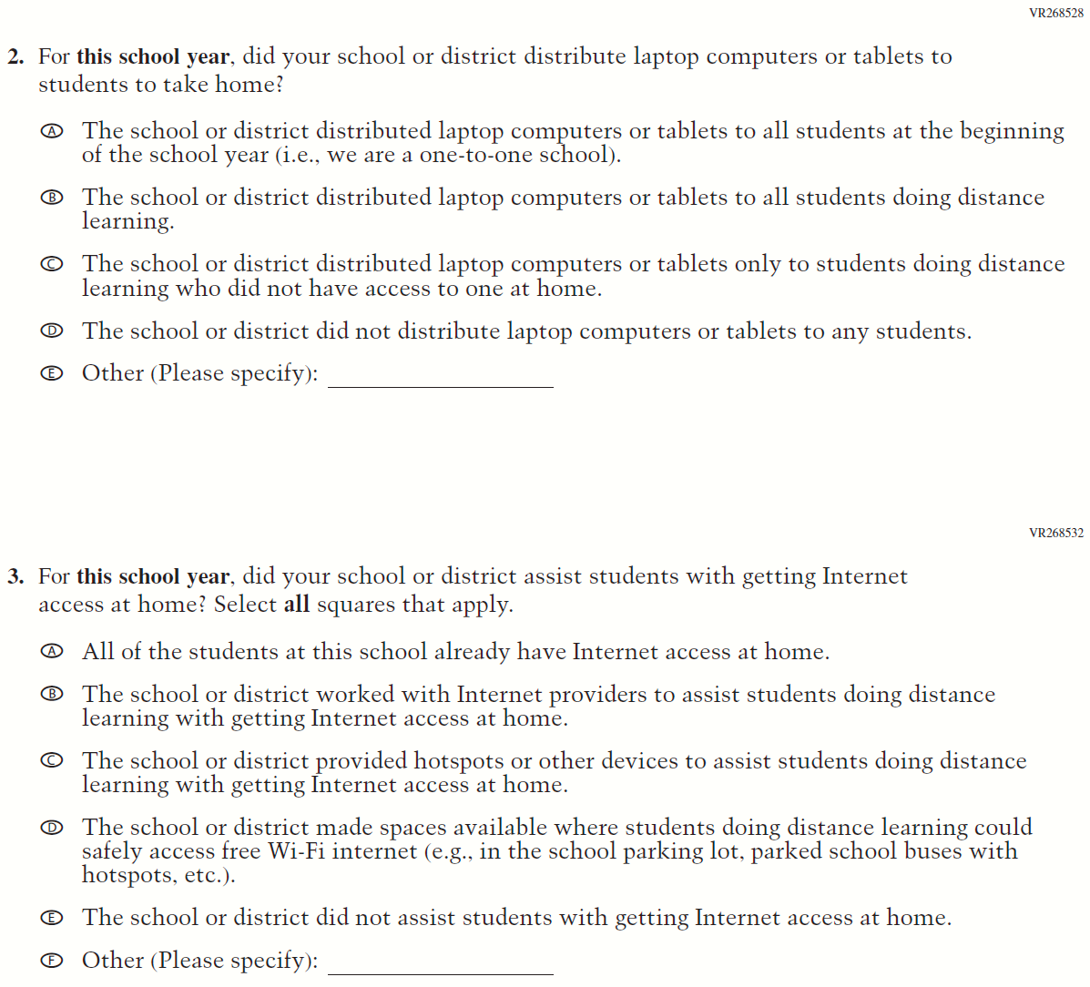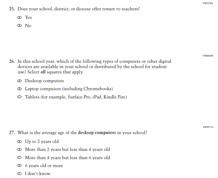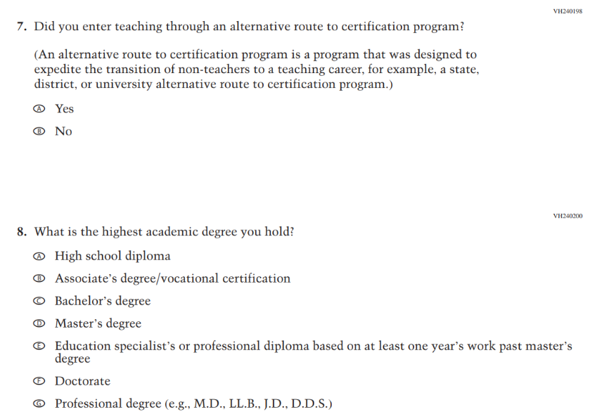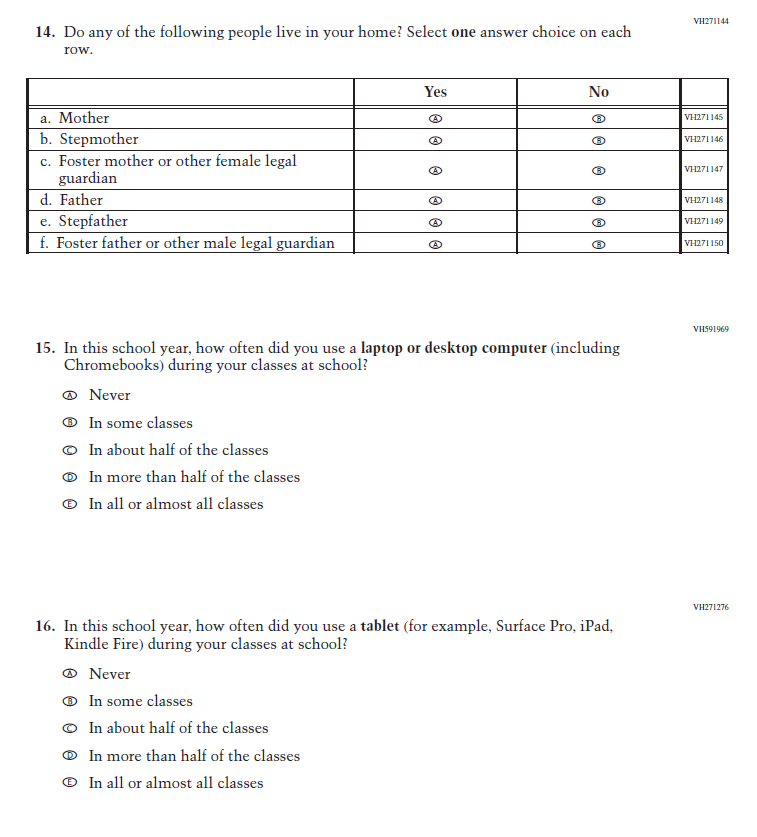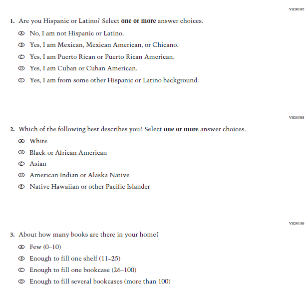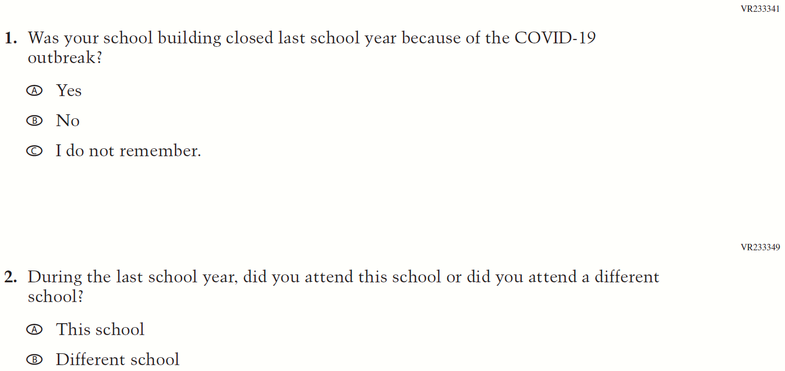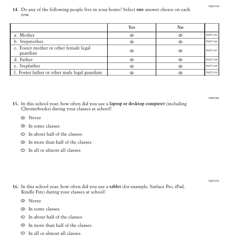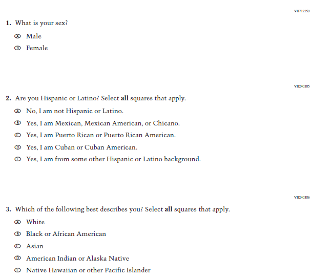 Important changes in how we collect demographic information will be reflected in the 2026 instruments when they are ready for publication and review. In March 2024, the Office of Management and Budget (OMB) announced revisions to Statistical Policy Directive No. 15: Standards for Maintaining, Collecting, and Presenting Federal Data on Race and Ethnicity (SPD 15) and published the revised SPD15 standard in the Federal Register (89 FR 22182). See Part A.7 of this package to see how NCES plans to incorporate these revisions into NAEP 2026. Further, as we were preparing this package for 30D publication, the White House issued an Executive Orders “Defending Women from Gender Ideology Extremism and Restoring Biological Truth to the Federal Government,” (January 20, 2025) and “Ending Radical and Wasteful Government DEI Programs and Preferencing,” (January 20, 2025). In compliance with these Executive Orders, the materials in this package have been modified. In addition, a full review of all items is being conducted to ensure compliance with the Executive Orders. The revised questionnaires will be included in the next Amendments to this package. No collections of this information will take place before the submission and approval of Amendment #2.