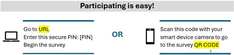 To complete the survey, type URL into your web browser and enter this secure PIN: [PIN] or scan the QR code shown at the top of this postcard.