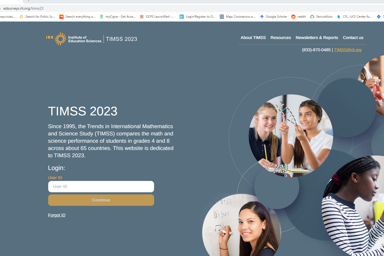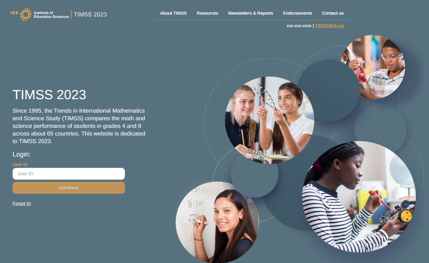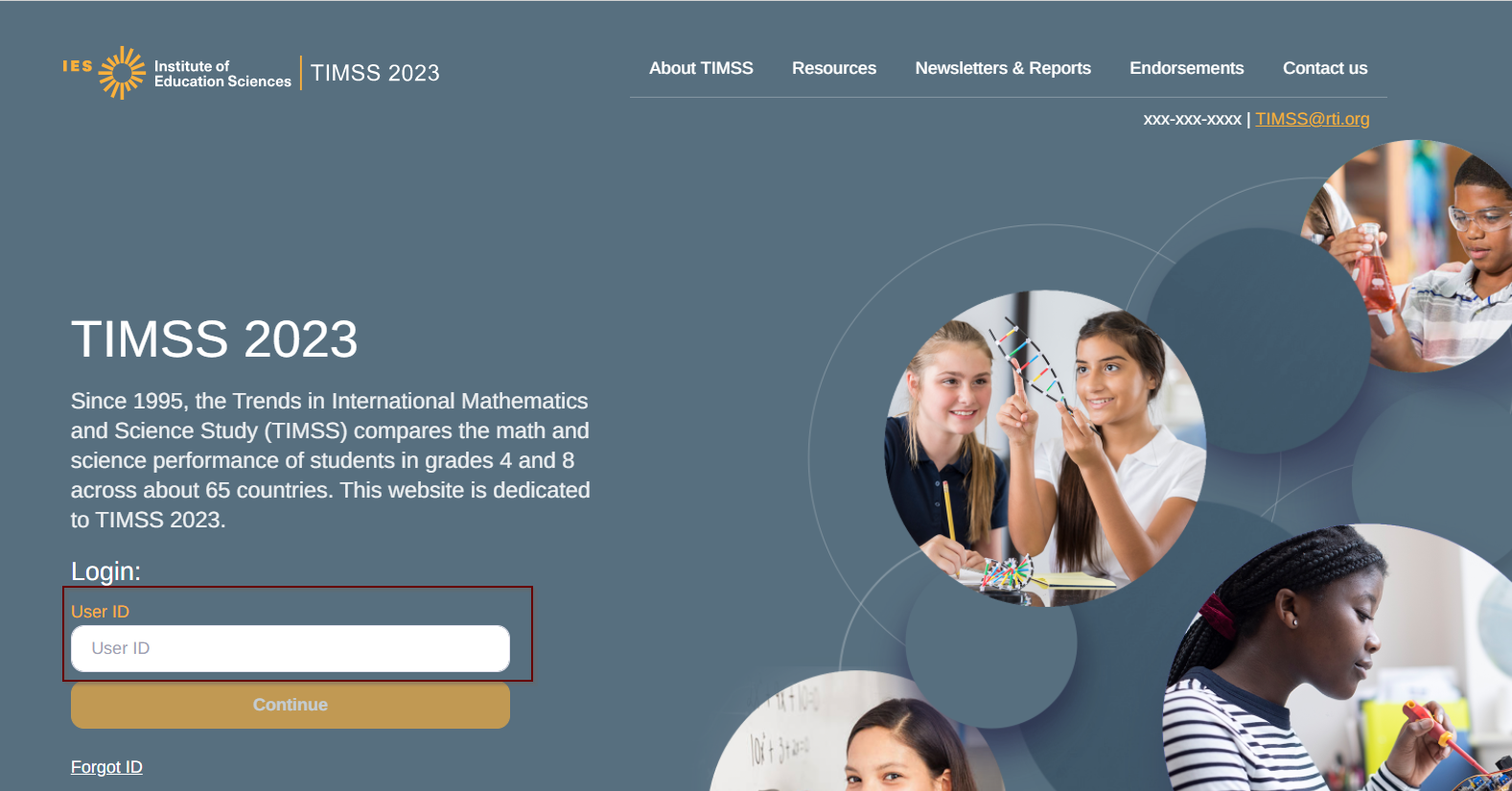 Log in to https://surveys.nces.ed.gov/TIMSS to complete and submit your 8th grade STLF. If you have forgotten your login USER ID please contact the TIMSS helpdesk at TIMSS@rti.org or 1-833-870-0485. If you have forgotten your password, you can request a new password on the TIMSS login page.