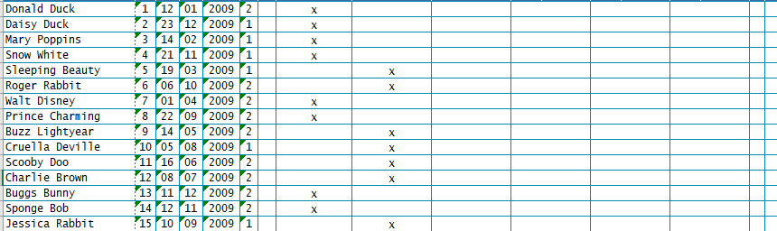 an 'X' in each student's row for any/all science classes they take.