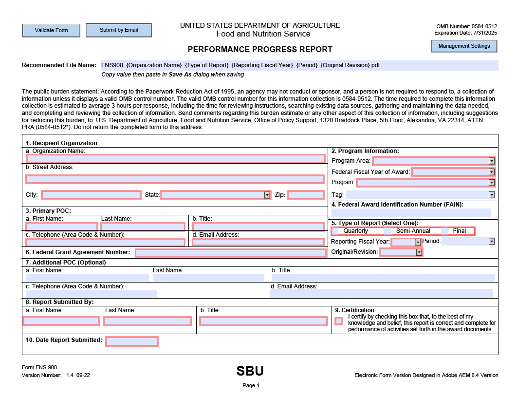 Note: This section describes progress report requirements and introduces the FNS-908 PPR form. All RFAs are required to include the PPR form and all grantees are required to use the FNS-908 PPR form when submitting Progress Reports.