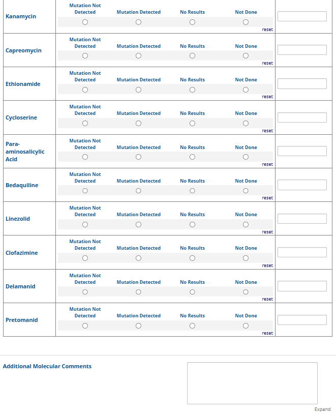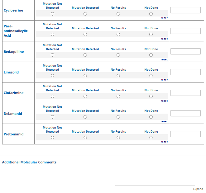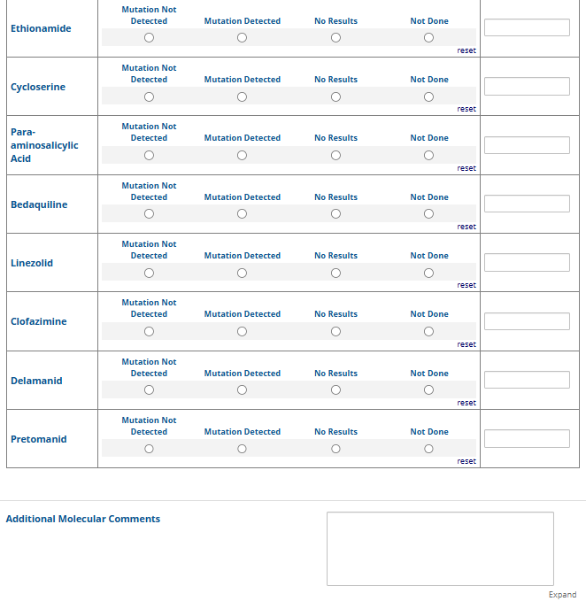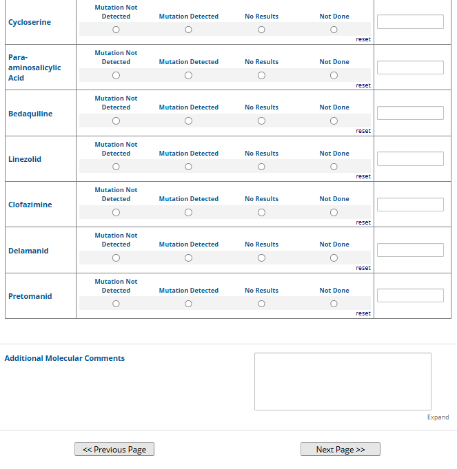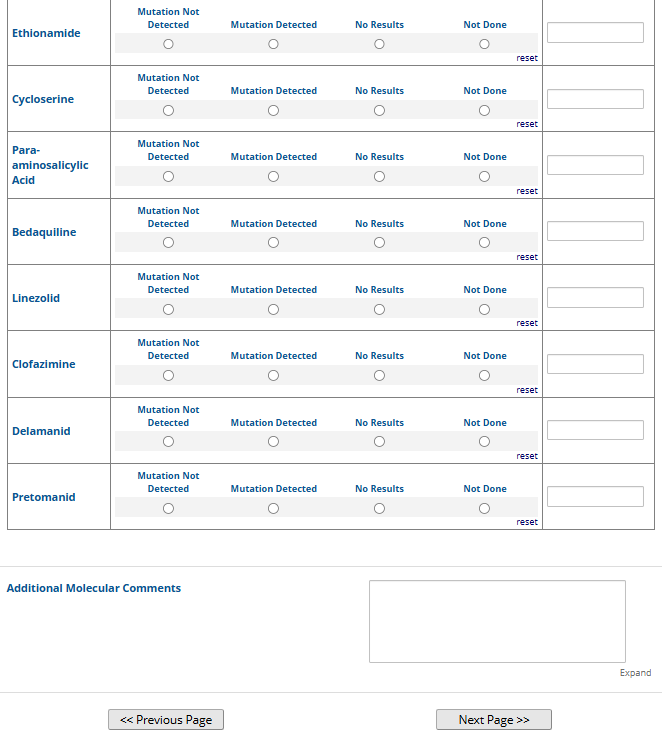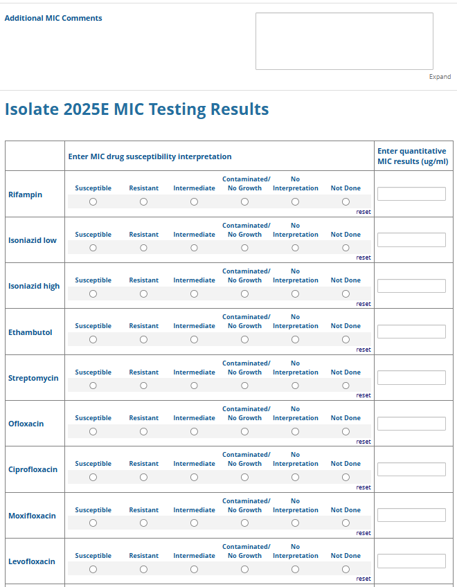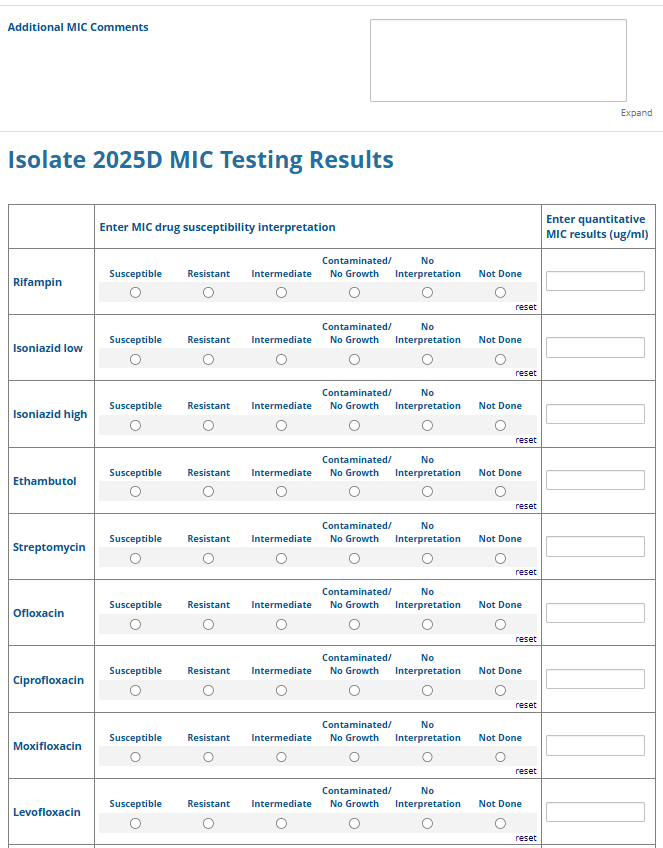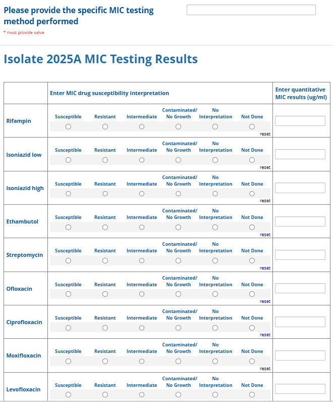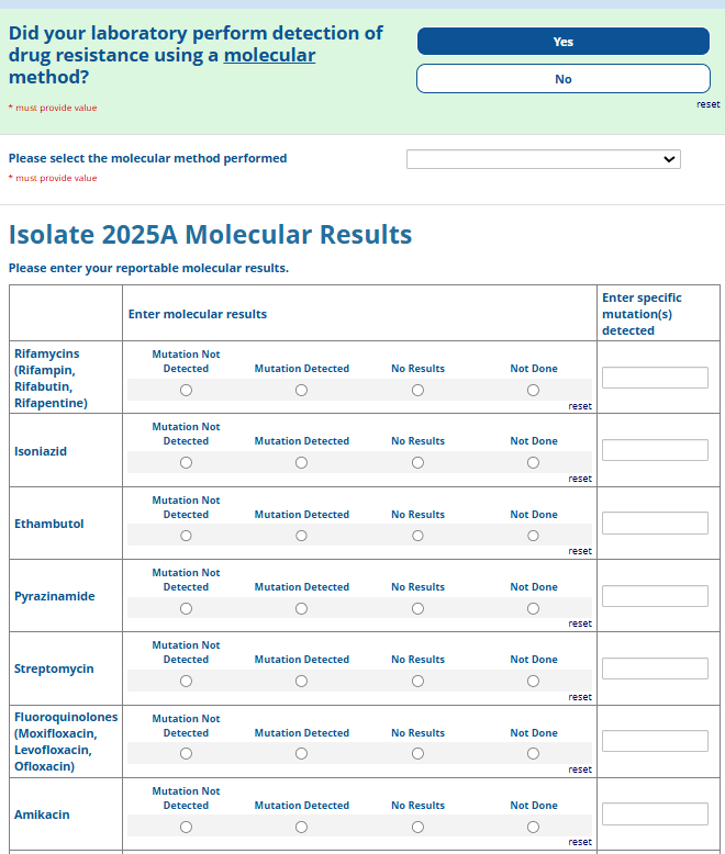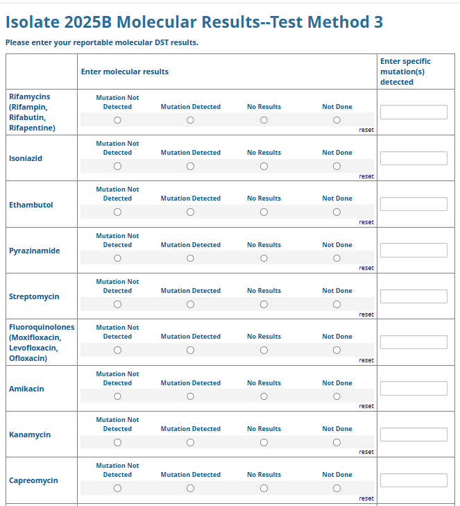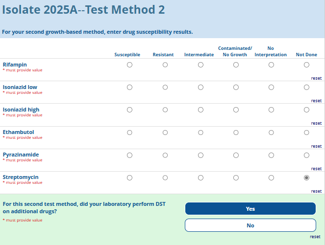 Respondents are able to submit up to two growth-based drug susceptibility testing (DST) methods and results and three molecular testing methods and results. The data collection instrument is built to include logic (a survey tool that allows a tailored question path based on respondents’ answers) to reduce burden for participating laboratories or respondents who only perform one DST method. This logic includes asking whether growth-based DST was performed (if the answer is yes, then a question is asked to determine whether a second growth-based method was performed) and whether molecular testing for drug resistance was performed (if the answer is yes, then questions are asked to determine whether a second and third molecular method was performed).