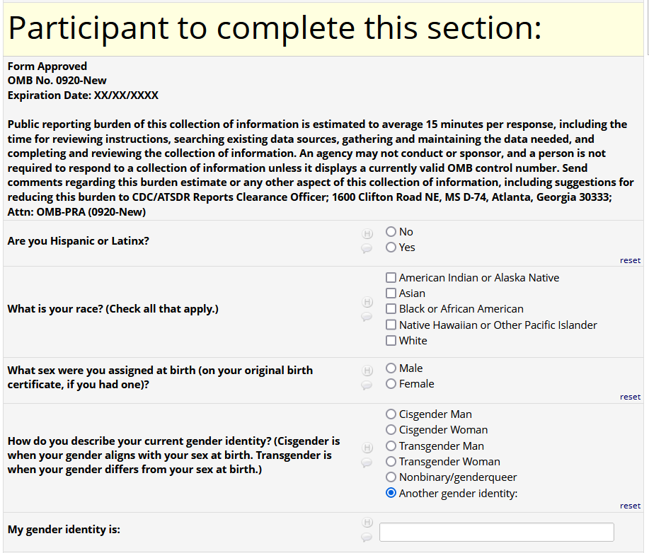 Public reporting burden of this collection of information is estimated to average 15 minutes per response, including the time for reviewing instructions, searching existing data sources, gathering and maintaining the data needed, and completing and reviewing the collection of information. An agency may not conduct or sponsor, and a person is not required to respond to a collection of information unless it displays a currently valid OMB control number. Send comments regarding this burden estimate or any other aspect of this collection of information, including suggestions for reducing this burden to CDC/ATSDR Reports Clearance Officer; 1600 Clifton Road NE, MS D-74, Atlanta, Georgia 30333; Attn: OMB-PRA (0920-1357)
