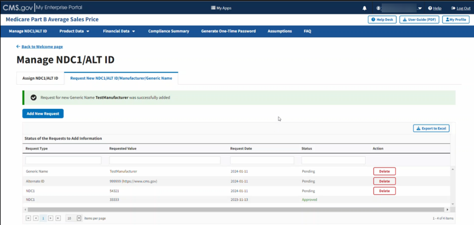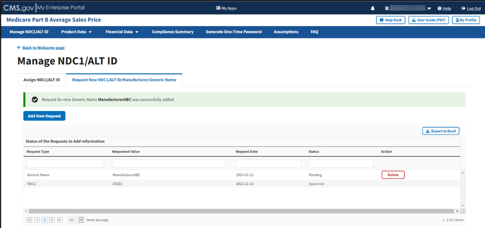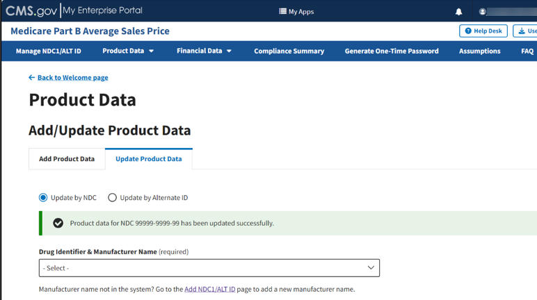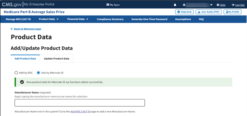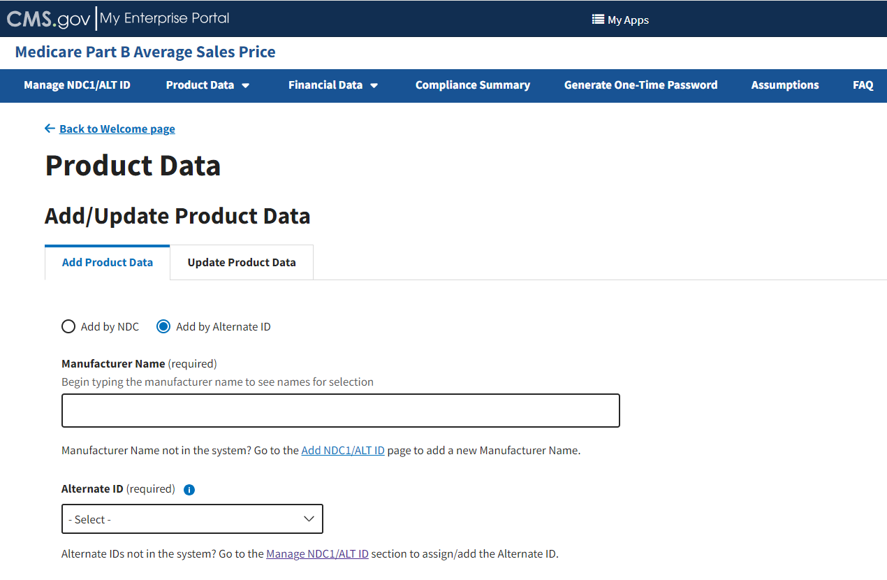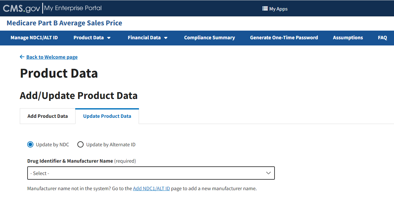 From the Medicare Part B Average Sales Price homepage, click the Manage NDC1/ALT ID tab.
