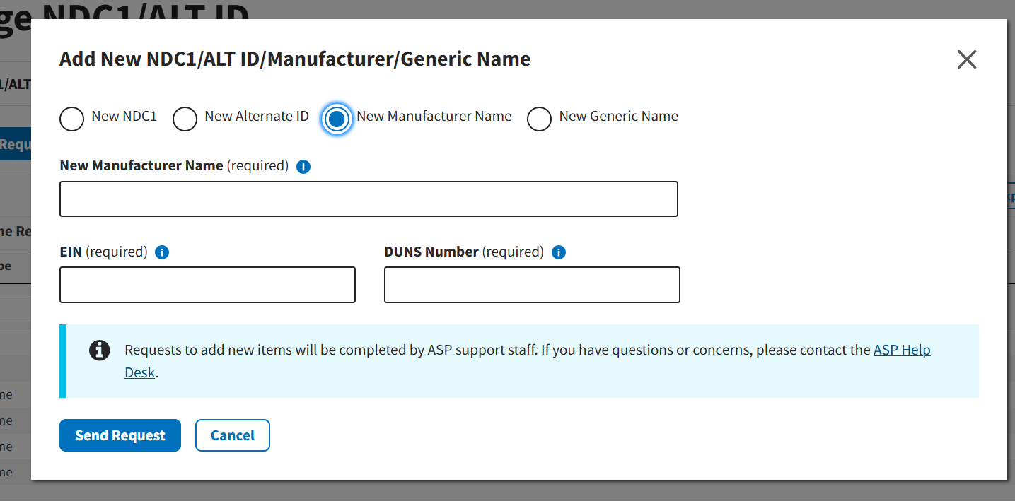 Figure 17: Request New NDC1/ALT ID/Manufacturer/Generic Name Page
