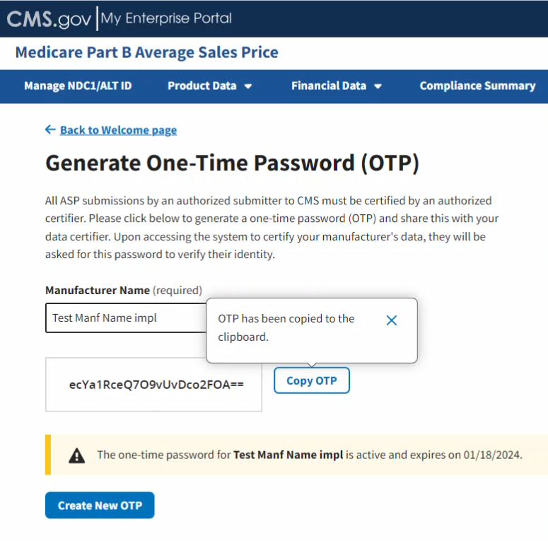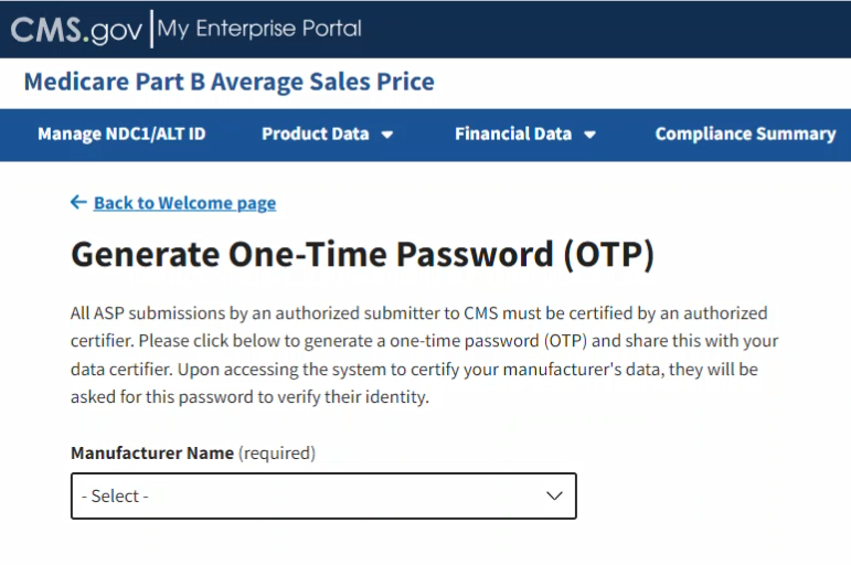 The following sections describe the functionality of each menu tab on the ASP homepage, including Manage NDC1/ALT ID, Product Data, Financial Data, Compliance Summary, Generate One-Time Password, Assumptions and FAQ.