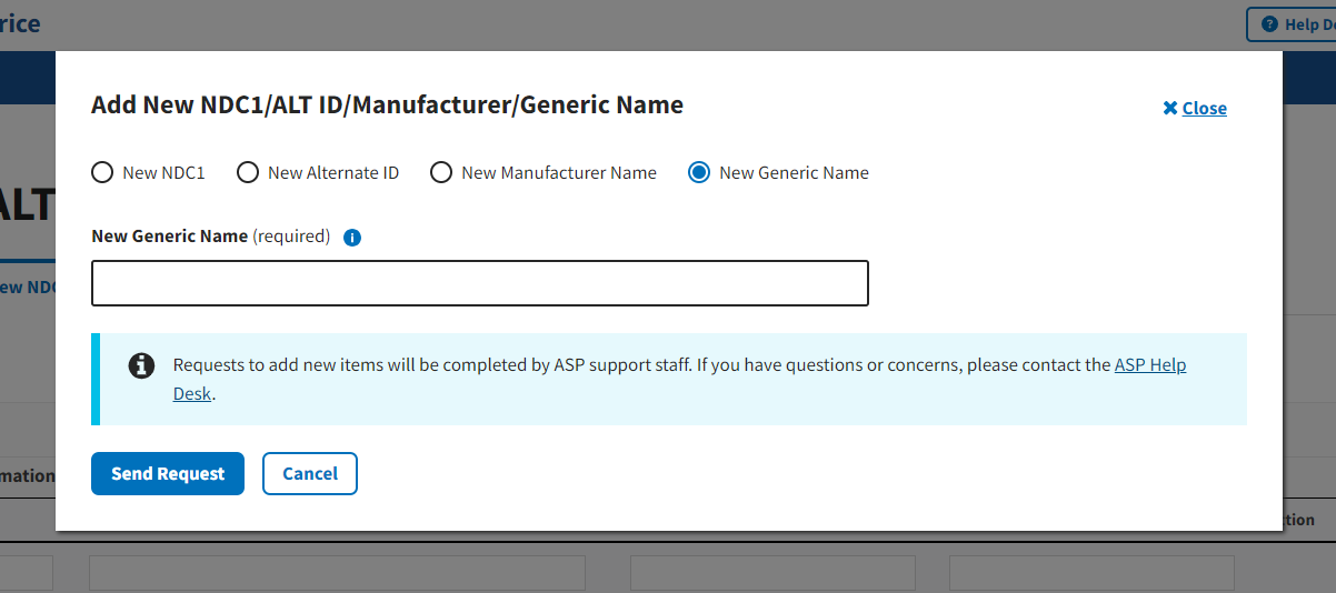 Figure 18: Request New NDC1/ALT ID/Manufacturer/Generic Name Page - Add New NDC1