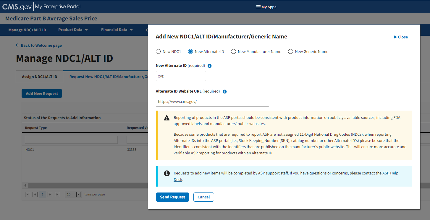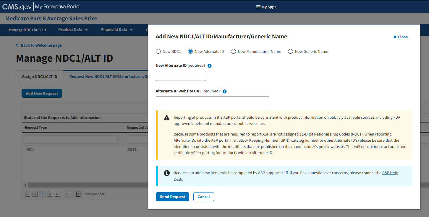 Figure 21: Request New NDC1/ALT ID/Manufacturer/Generic Name Page - Add New ALT ID 15