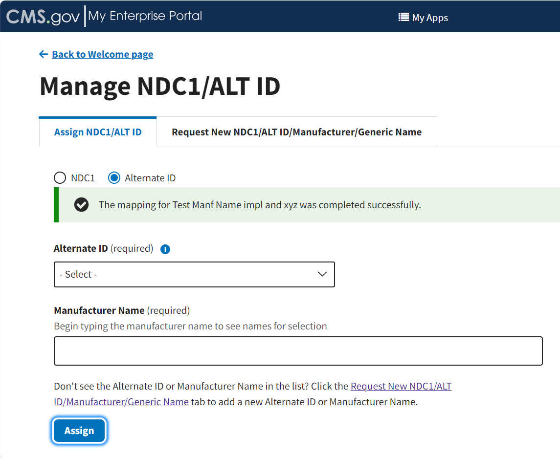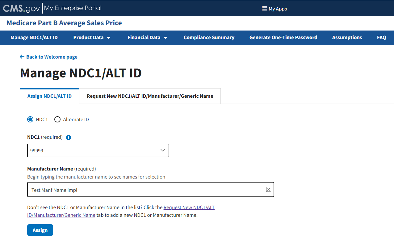 Figure 9: Manage NDC1/ALT ID Page - Assign NDC1