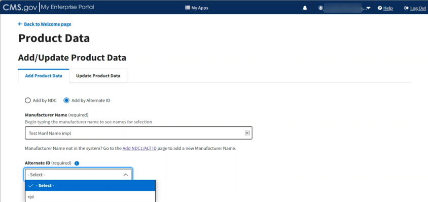 Figure 15: Manage NDC1/ALT ID Page - Enter ALT ID Manufacturer Name