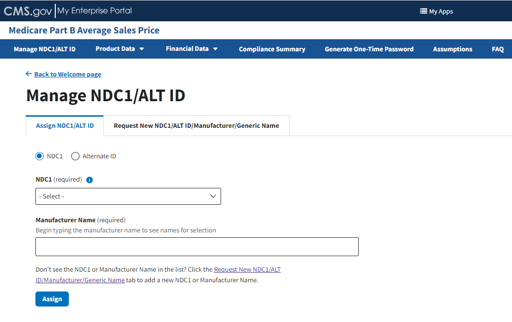 Navigate to the Manage NDC1/ALT ID page, which automatically opens on the Assign NDC1/ALT ID tab.