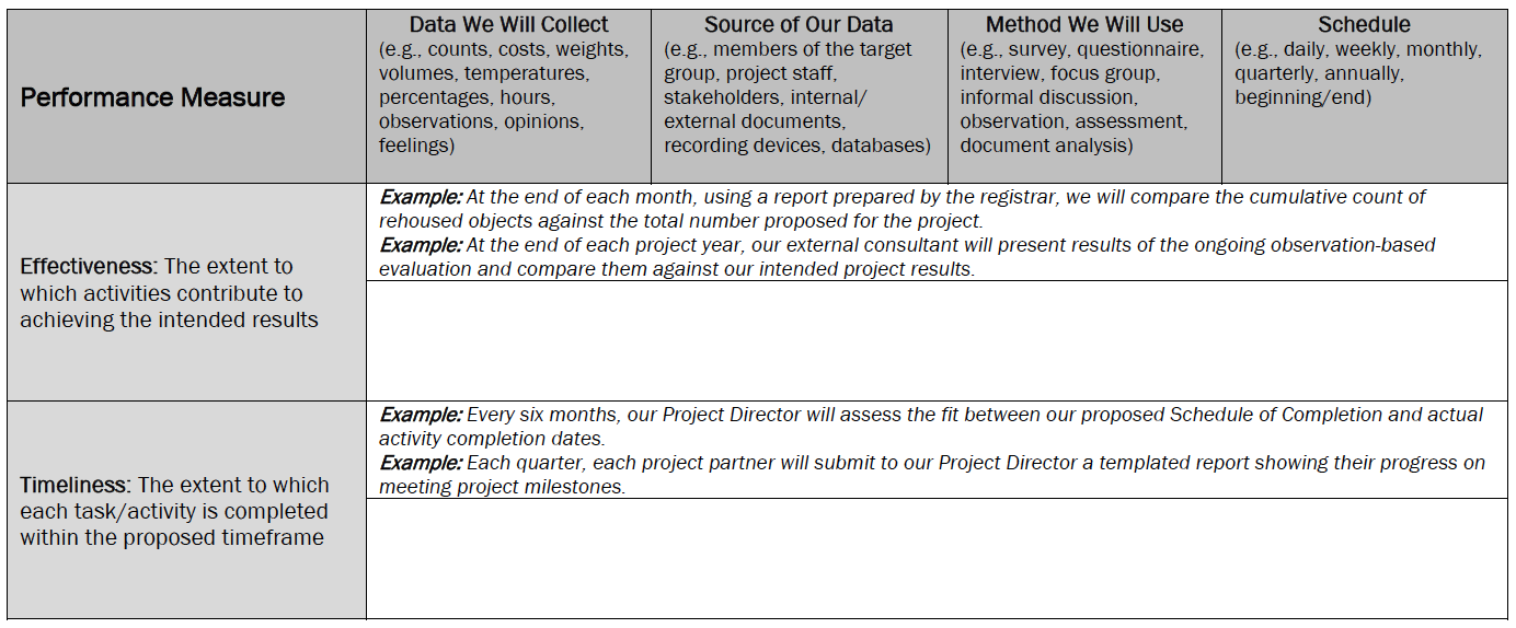 Each applicant is asked to describe how they will monitor and assess their performance in carrying out their project as a whole using these two measures (see Section D2c Item 5).