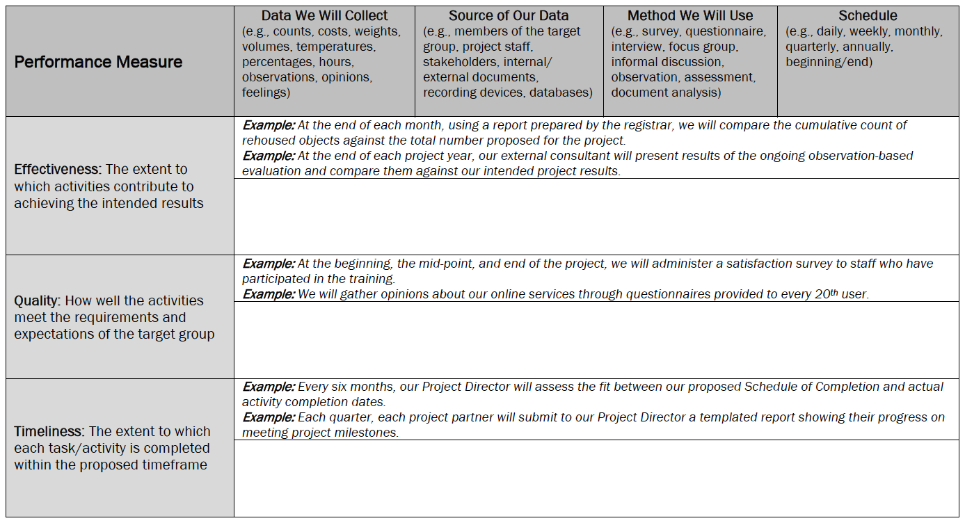 Each applicant is asked to describe how they will monitor and assess their performance in carrying out their project as a whole using these three measures (see Section D2c Item 6 of this Notice of Funding Opportunity).