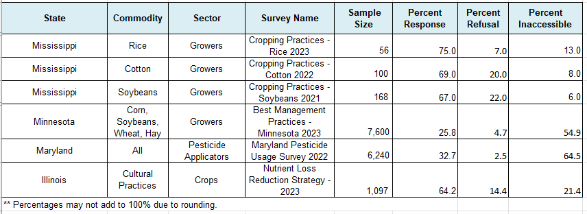 Telephone follow-up is the most common mode of nonresponse follow-up for most of the surveys in this docket. Mississippi’s Cropping Practices survey utilizes face-to-face interviews as much as possible. Illinois, Maryland, and Minnesota have limited face-to-face interviews based on knowledge of the respondent and his or her response history. The data collection goal is to obtain a complete response from each of the operations in the sample, staying on time and within budget. Data collection periods for each survey are determined based on the publication date and the necessary post-data collection processing activities (summarization, analysis, preparing the publication, etc.).