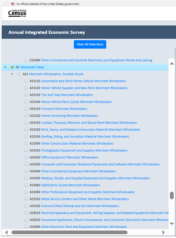 Establishment survey respondents often rely on a survey preview to support response. However, there is no designated survey form for the AIES as questions are specific to a company’s industry (or industries). As such, the Census Bureau developed an interactive content selection tool for previewing questions specific to a company’s assigned North American Industry Classification System (NAICS) code(s) to support response to the AIES.