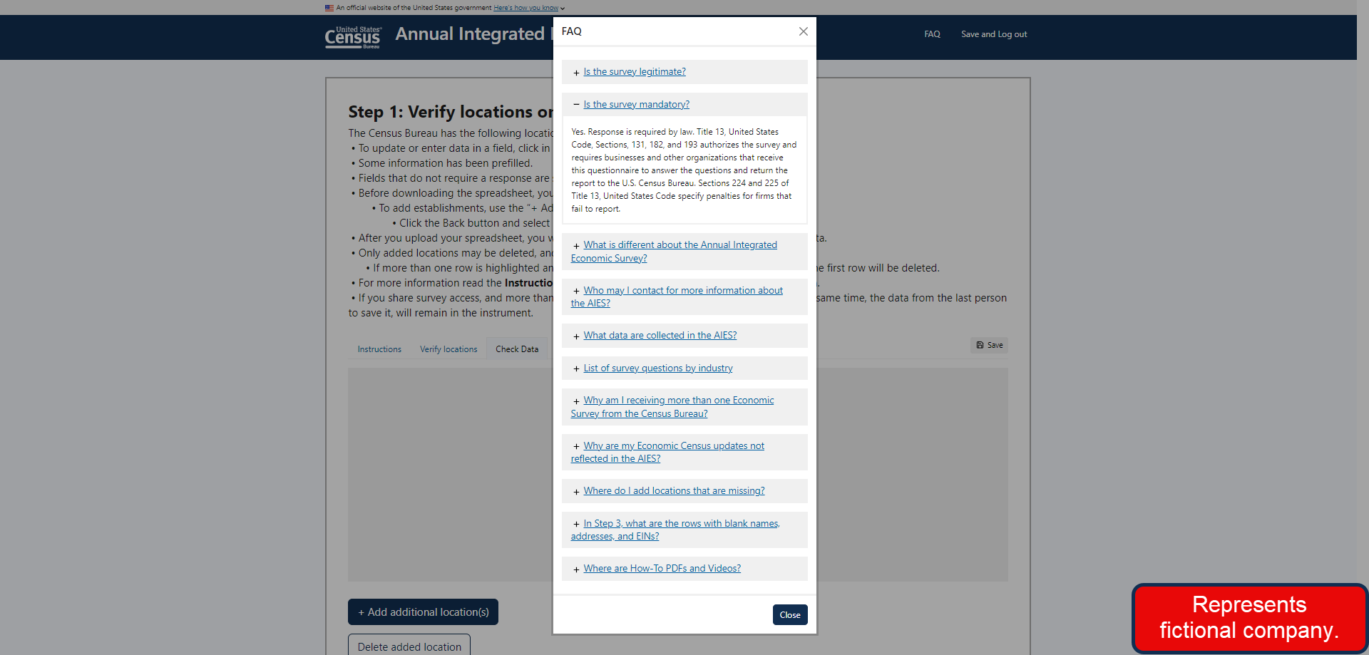 Upon accessing the portal, respondents could access Frequently Asked Questions through a link in the upper left corner of the screen. This brought up an overlay ‘modal’ screen with additional information for response. See Figure 4 for a screenshot of the FAQ overlay screen. The information contained in this overlay screen pertained to providing a response, and was not about any specific questions on the survey instrument. Respondents could also access a PDF document that provided additional response support – again, not the content of the survey, but rather instructions for providing response overall.
