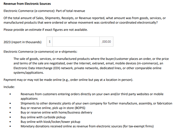 Now I’d like to review a survey question with you about reporting e-Commerce data. There are no right or wrong answers, I just want to learn more about how you understand this question to make sure it’s working well for everyone. [INTERVIEWER INSTRUCTION: share screen to respondent and confirm they can view your screen. If possible, share only the window with the e-commerce question. Share current AIES e-Commerce question ONLY, that is the first page of the PDF].