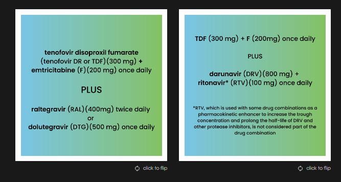 We also use flip cards throughout the modules as a way for providers to actively engage with the content rather than reading text on a screen. Providers are encouraged to click on the card to flip it for more information on that topic. The screenshots below show the front and back of a set of flip cards on PEP regimens.