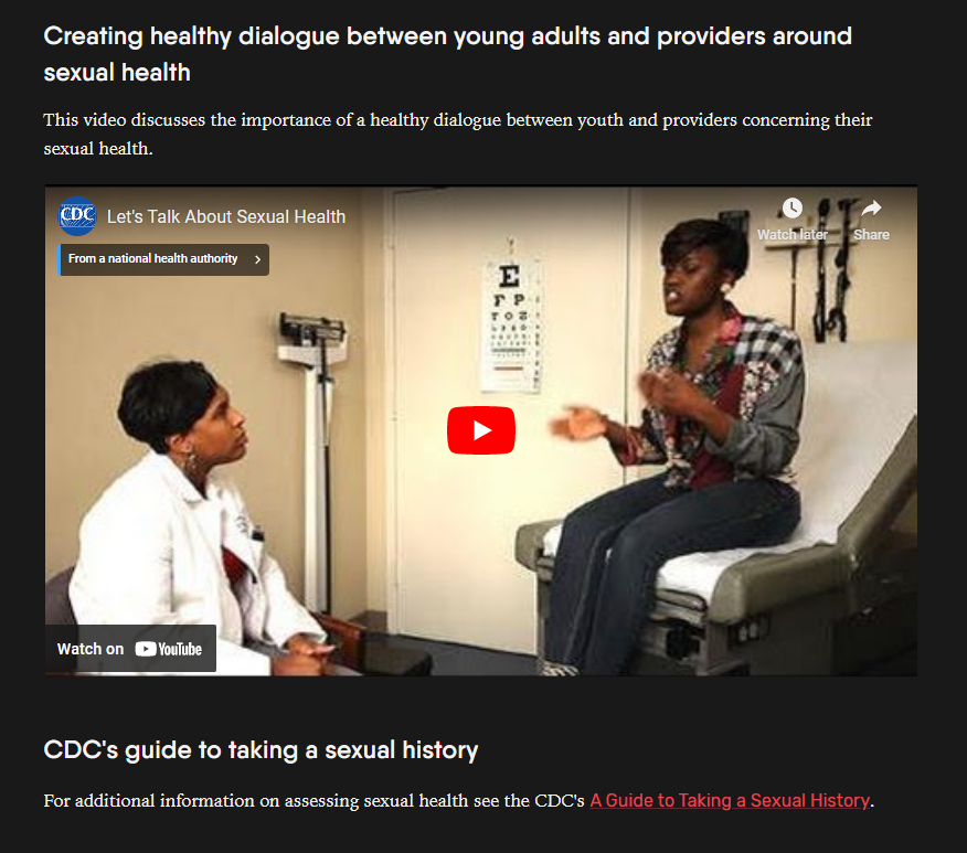 We also incorporate brief videos and hyperlinks to resources throughout the training on relevant topics. In module 2 we included a CDC created video on how to conduct a sexual health assessment and a hyperlink to the CDC’s A Guide to Taking a Sexual Health Assessment.