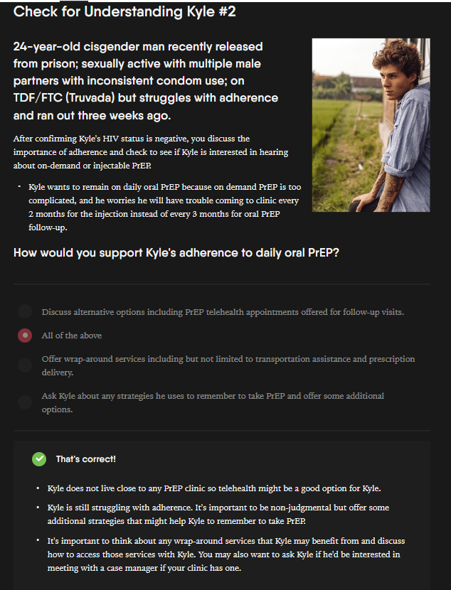 This module discusses strategies for increasing PrEP adherence and persistence. In most of the modules we include 1-2 case studies to help providers apply their new PrEP knowledge to real world cases they may encounter in clinic. In this module, we introduce providers to Kyle and ask a question based on the information provided in the case. In the screenshot below, we show an explanation for the correct answer.